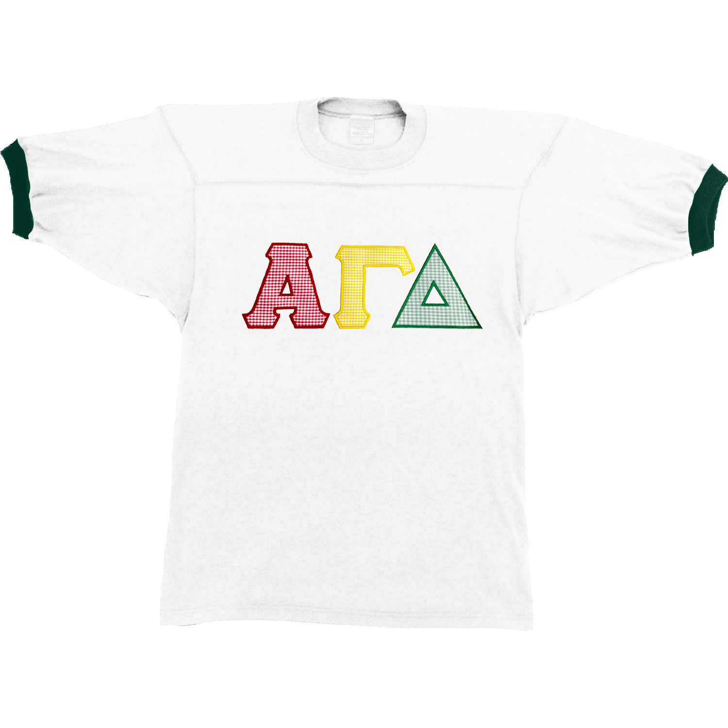 The Classic Sorority Jersey in White is a unisex short sleeve T-shirt made of 100% cotton. The shirt is predominantly white with kelly green cuffs on the sleeves, giving it a sporty, retro look. The front of the T-shirt features the Alpha Gam Greek letters seersuckered in red for Alpha (Α), yellow for Gamma (Γ), and kelly green for Delta (Δ) in green. The Greek letters are embroidered with tonal twill stitching and are also seersuckered to complement the colorful, collegiate aesthetic of the shirt. This jersey is the perfect addition to a sporty Alpha Gam wardrobe.